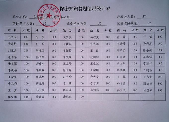 今年是新修訂保密法頒布5周年,保密法實施條例頒布1周年,也是全國“六五”保密普法教育收官之年。為進一步增強公司管理干部保密法制觀念,提升管理干部綜合管理水平,市公交公司于6月5日至10日組織公司57名管理干部參加了全省保密知識答題活動。答題方式采取試卷答題卡方式進行,合格率均達到了100%。