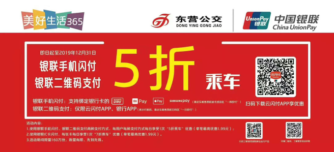 為倡導(dǎo)綠色低碳出行環(huán)境,讓市民充分享受到公交優(yōu)先發(fā)展的成果,自即日起至12月31日,市公交公司聯(lián)合銀聯(lián)再次推出便民服務(wù)舉措。市民使用銀聯(lián)手機(jī)閃付、云閃付APP二維碼或各銀行APP二維碼支付兩種支付方式,每用戶每種支付方式每天享受1次“5折乘車”優(yōu)惠(單筆最高優(yōu)惠1.99元);使用銀聯(lián)IC卡閃付每卡每天享受1次“7折乘車”優(yōu)惠。活動(dòng)期間優(yōu)惠總額160萬(wàn)元,先到先得,滿額為止。
